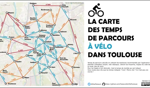 | Le collectif des Faiseurs de Ville a créé en 2020 une carte des temps de parcours à Toulouse, simplifiée et pratique. |